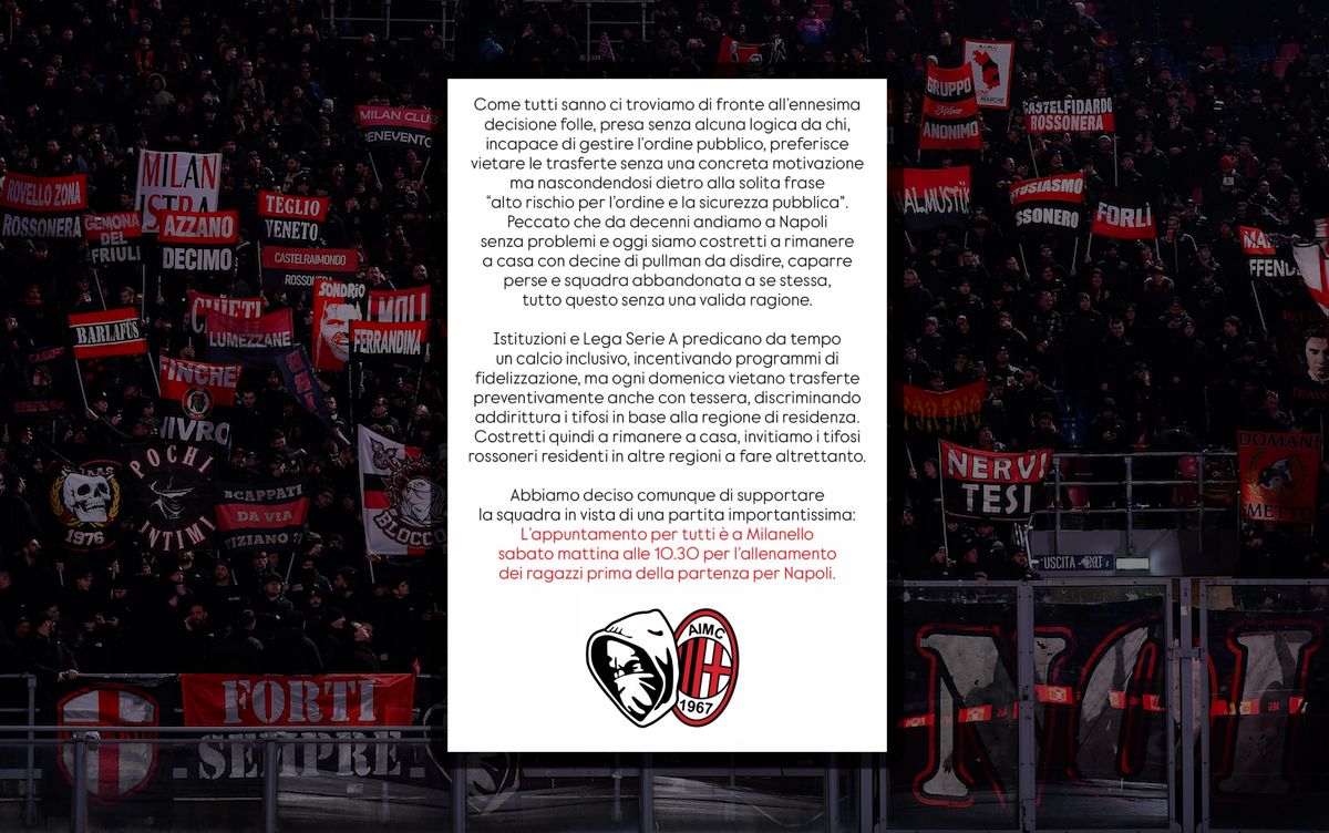 AC Milan’s primary fan group, Curva Sud, has organized a rally at Milanello to support the team after the Prefecture of Naples banned Lombardy-based supporters from attending Monday’s high-stakes fixture.